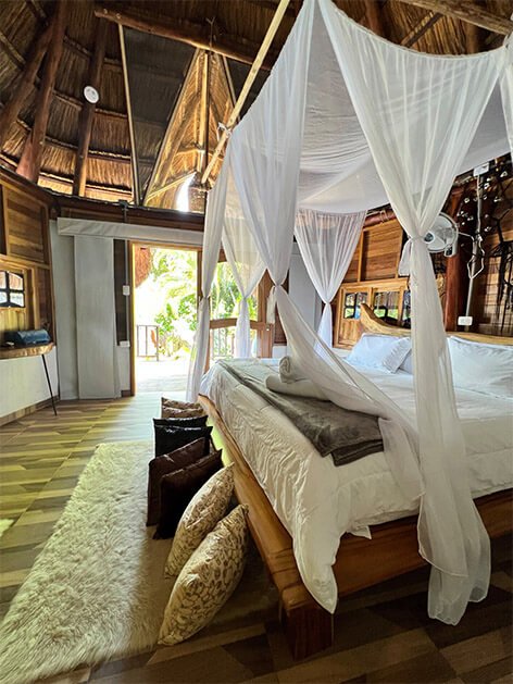 Enjoy a spacious 2x2 m bed, ceiling fans that keep the Caribbean breeze flowing, decorative mirrors, and a Smart TV for your moments of relaxation. The private bathroom is roomy and equipped with quality amenities, a fresh and cool water shower, and towels for use in the ecolodge and wet areas.